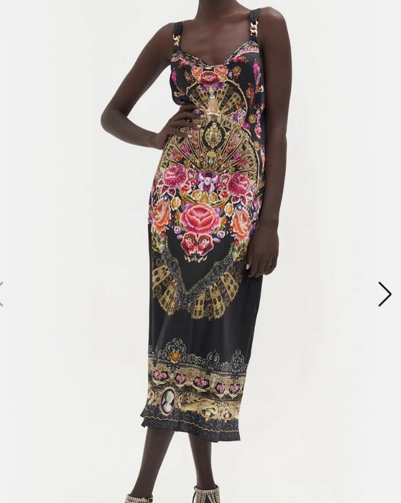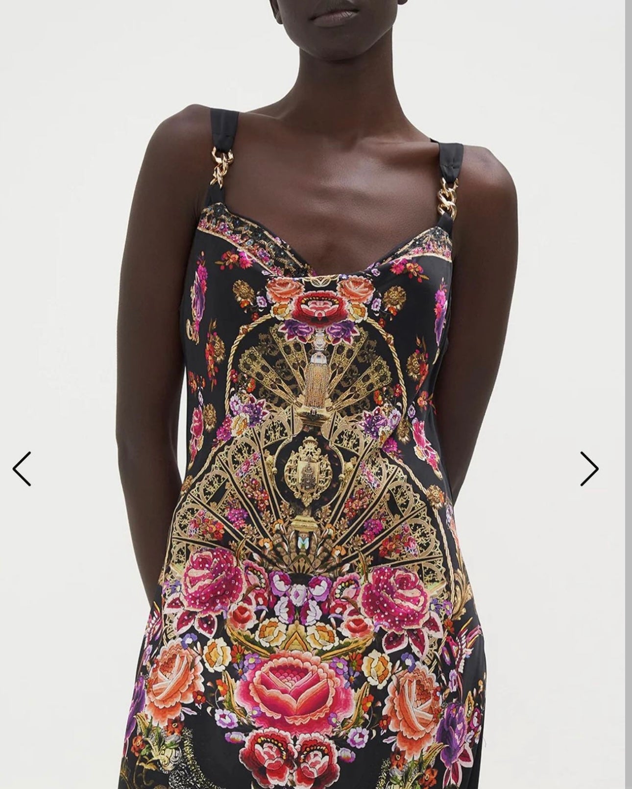 Our nineties uniform dripping in all that is ornate, the Dance With Duende Bias Slip With Wide Strap blends midnight hues, opulent gold fans, bouquets of botanicals and golden cascades into utter matrimony.